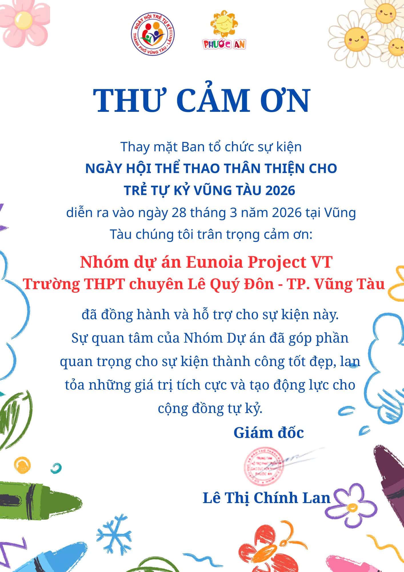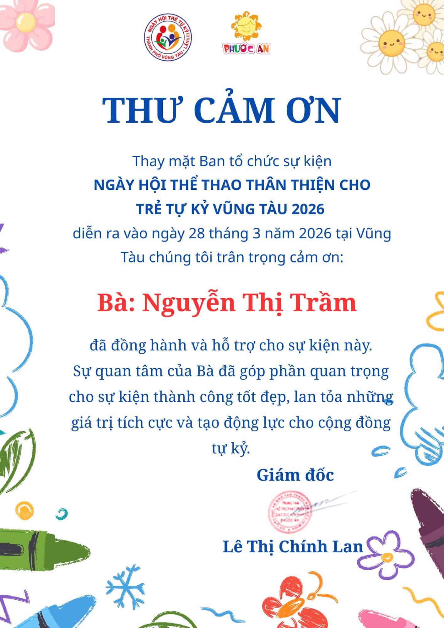 Trung tâm Hỗ trợ Phát triển Giáo dục Hòa nhập Phước An xin trân trọng gửi lời cảm ơn sâu sắc đến Quý cơ quan, đơn vị, nhà tài trợ và các cá nhân đã đồng hành cùng chương trình “Ngày hội Thể thao thân thiện cho trẻ tự kỷ Vũng Tàu 2026”.